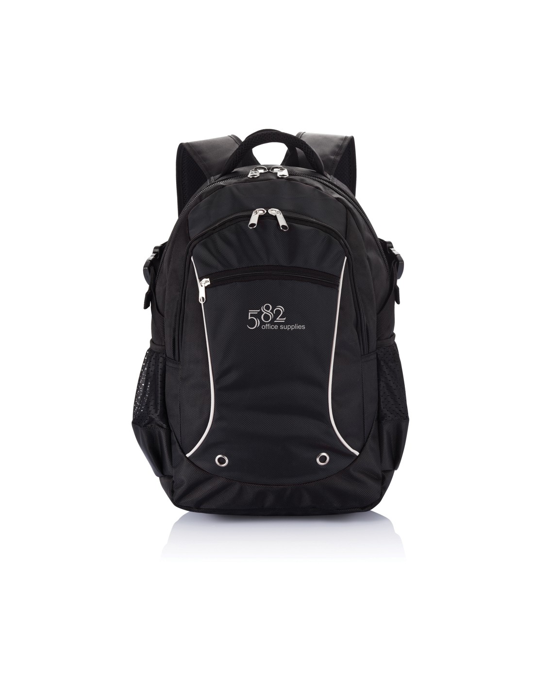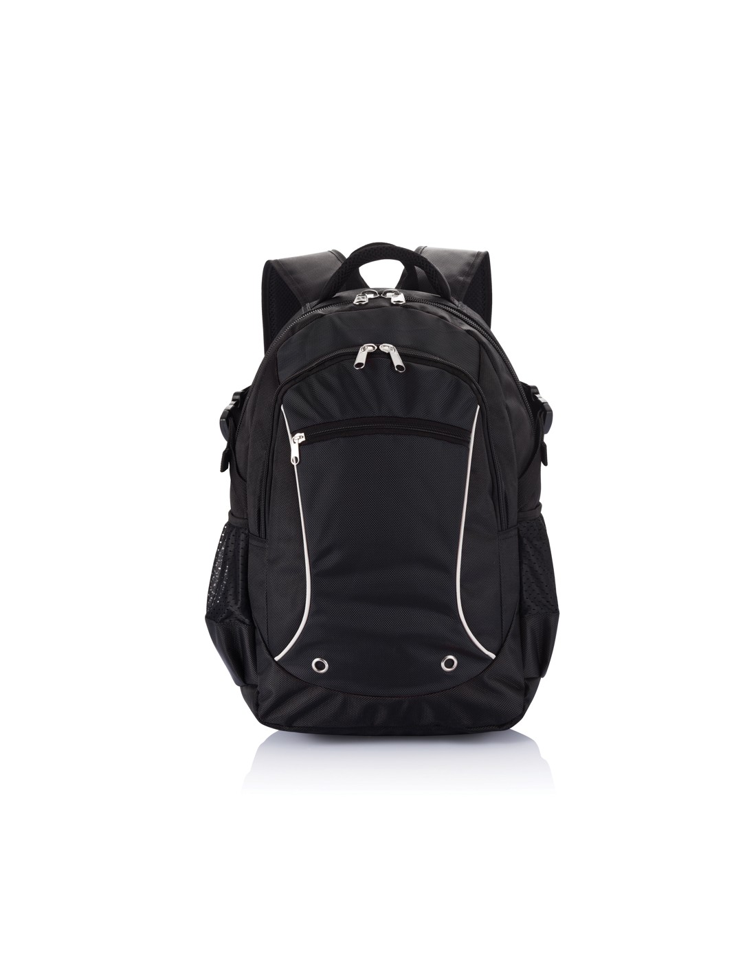 Zaino in tessuto 1680D jacquard. Tasca frontale con cerniera e organizer all’interno. Scomparto principale portacomputer da 15,4” con tasca imbottita. Profili riflettenti. Tasche in rete. Senza PVC.