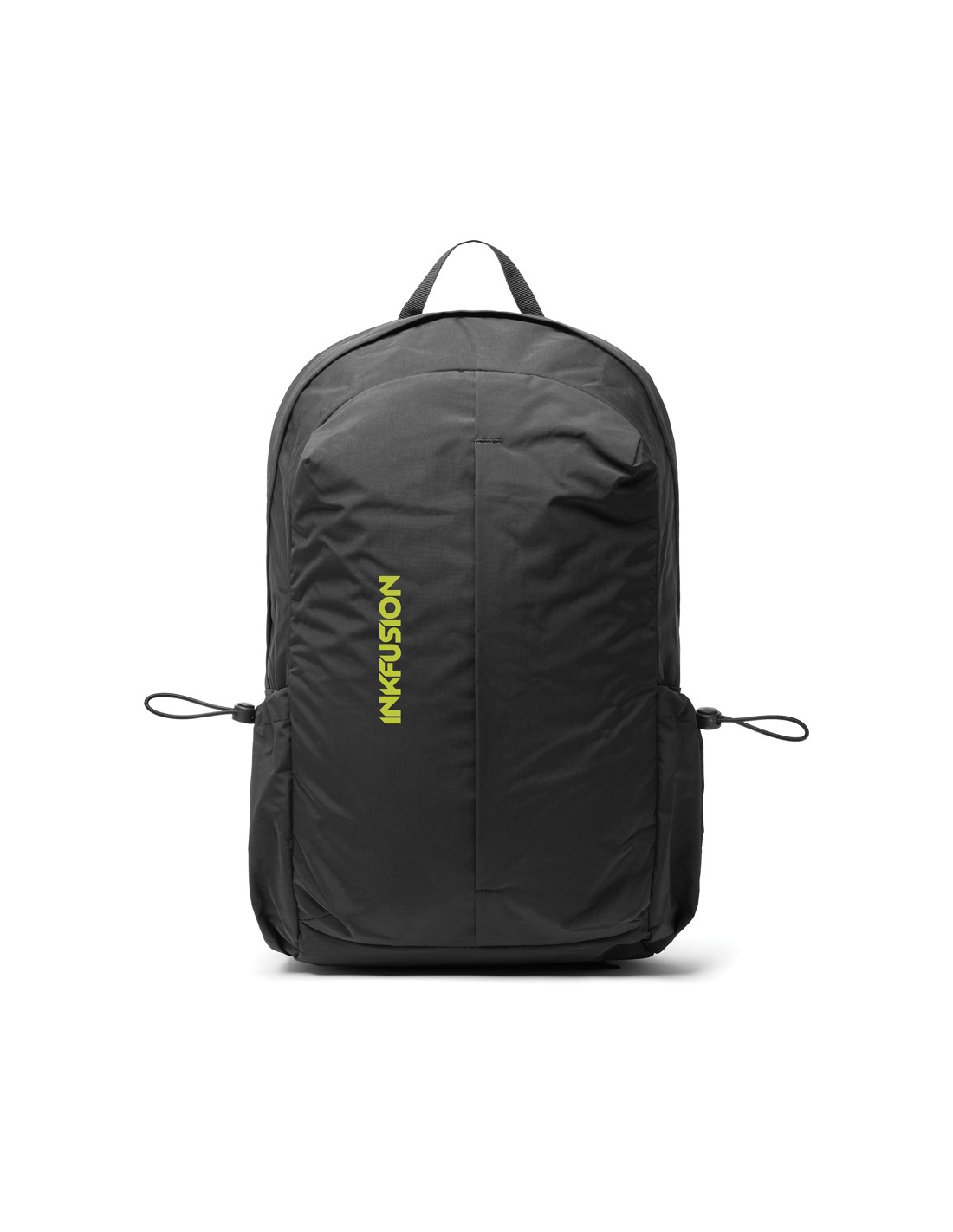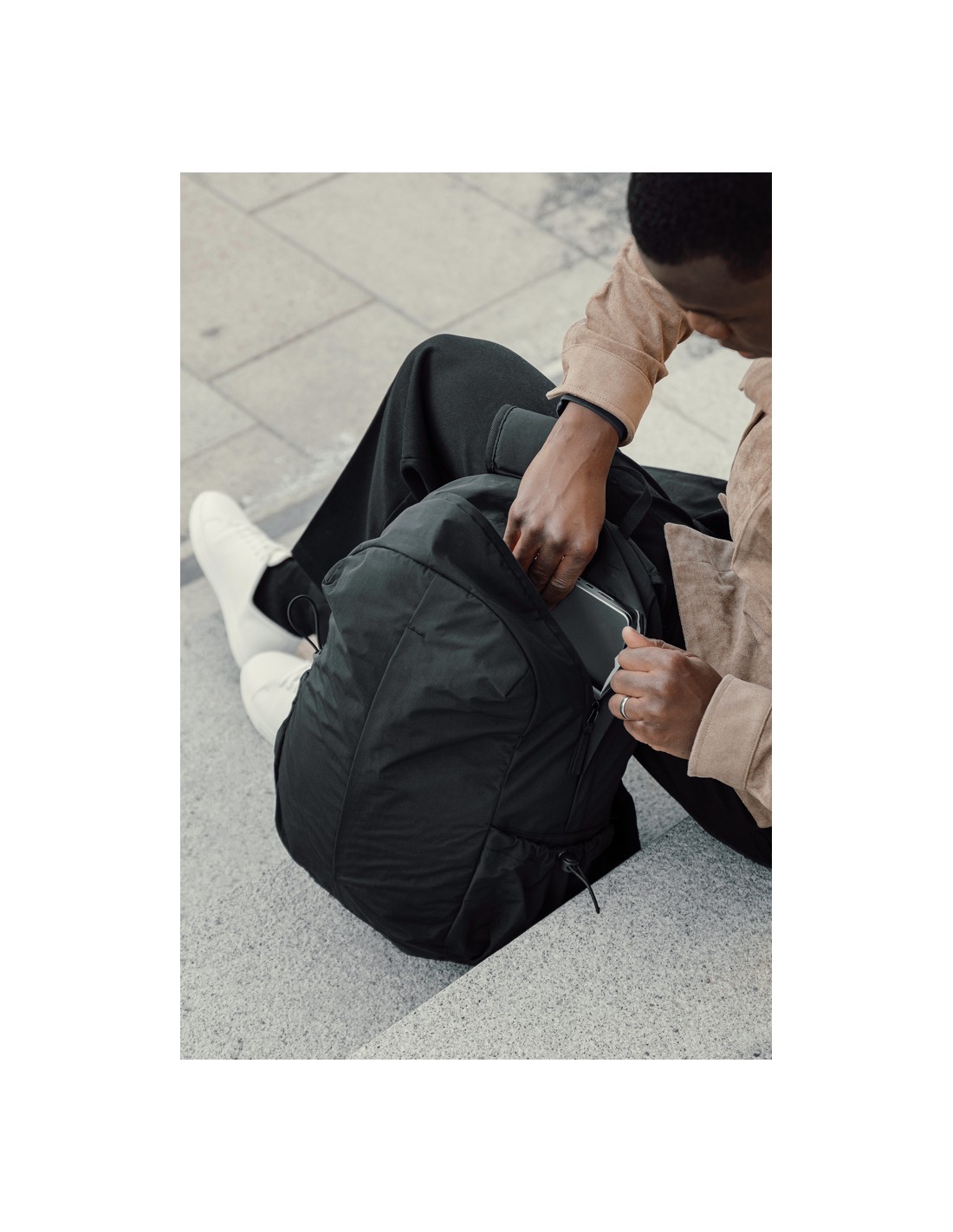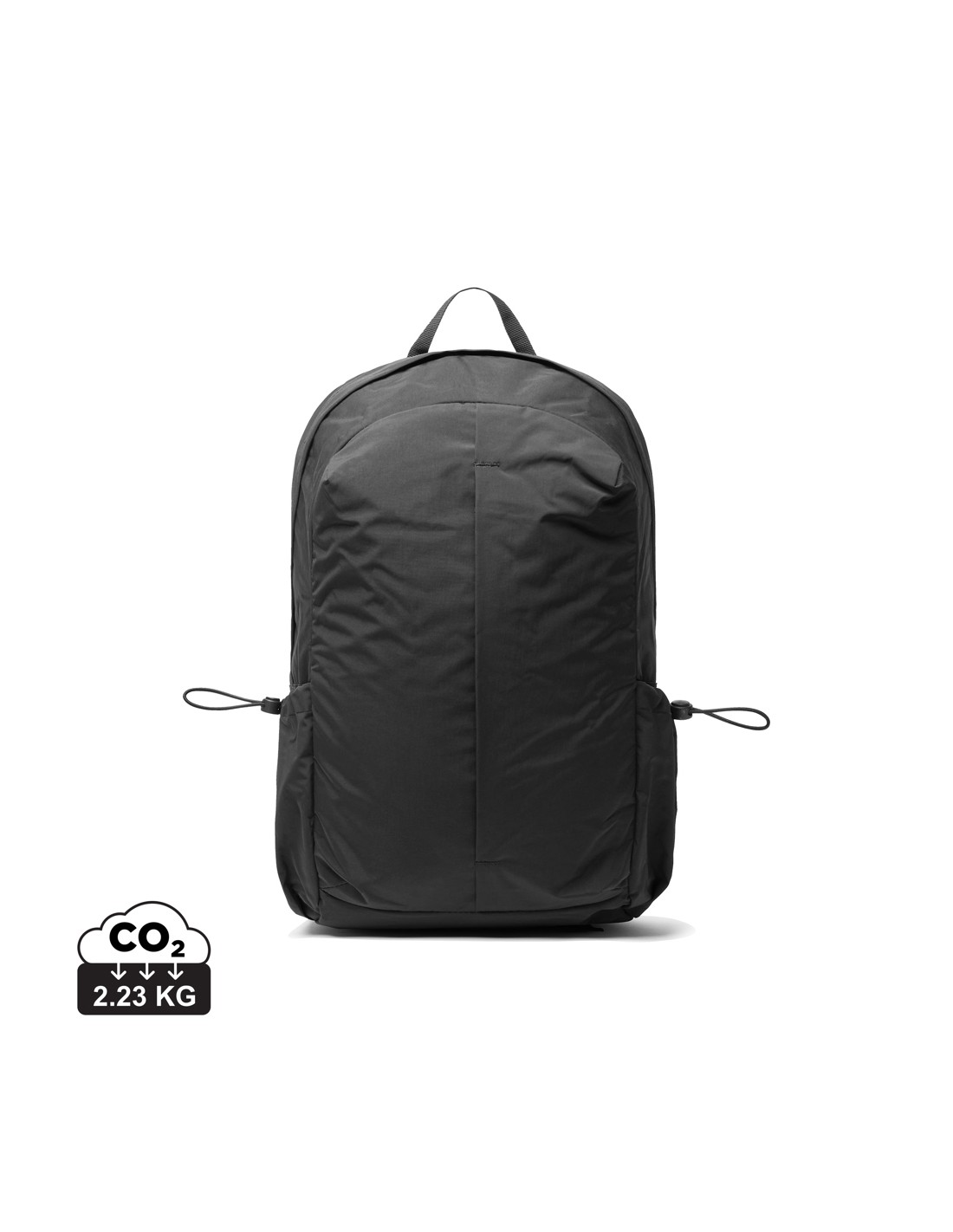Zaino per laptop da 15 pollici in cotone riciclato e poliestere riciclato (70%/30%). Ha una tasca frontale con cerniera e una tasca con cerniera sul lato posteriore. Schienale e spallacci imbottiti. Custodia per valigia.