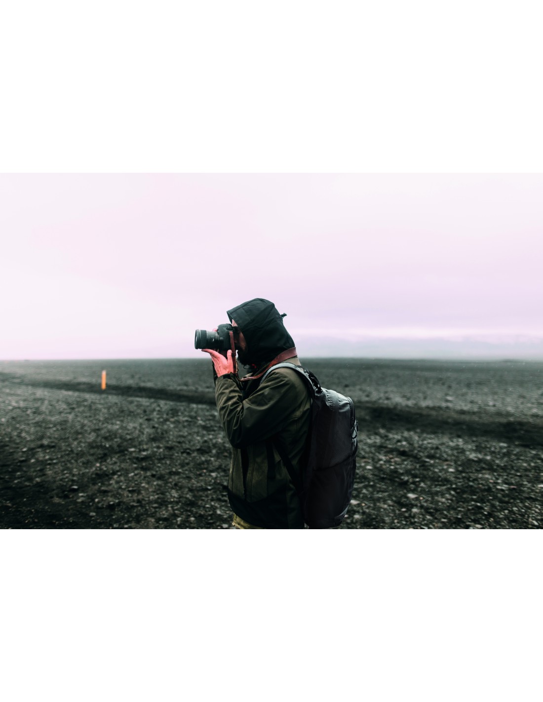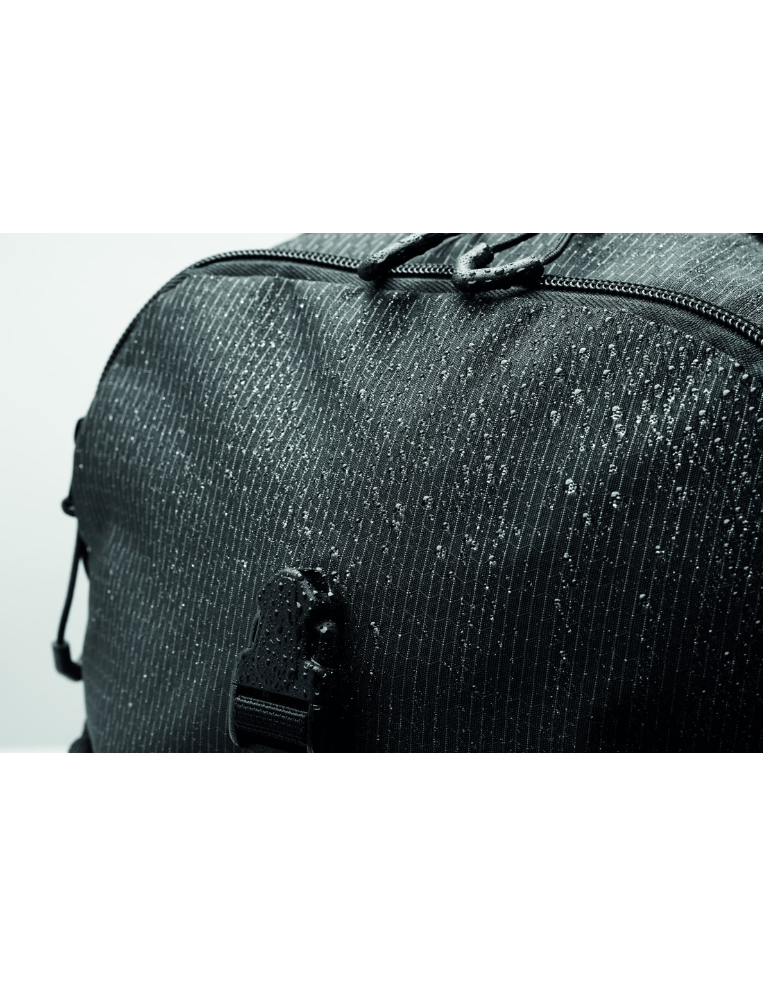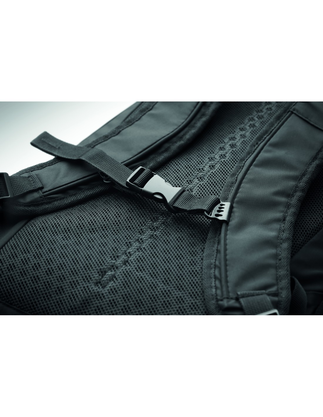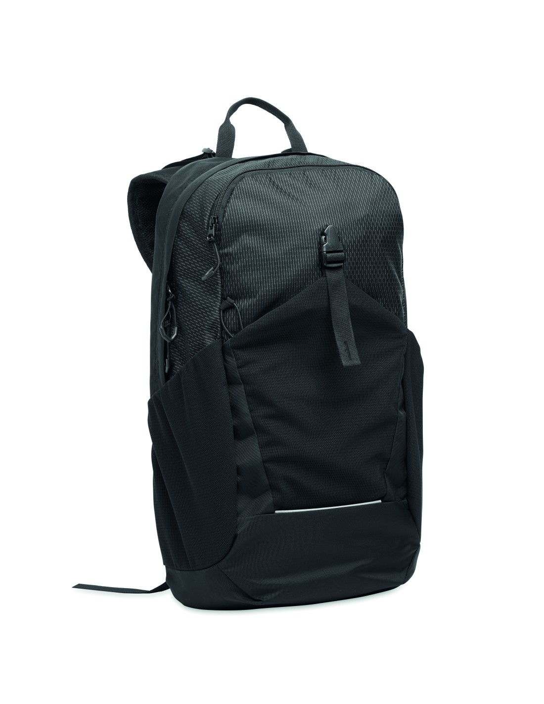 Zaino da trekking 18 L in nylon 420D idrorepellente con banda riflettente e scomparto interno per laptop da 15''. Scomparto frontale con cerniera e una tasca frontale scorrevole con chiusura a fibbia. Due tasche laterali. Schienale e spallacci imbottiti.