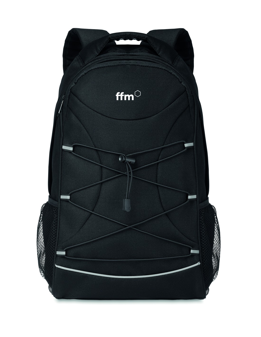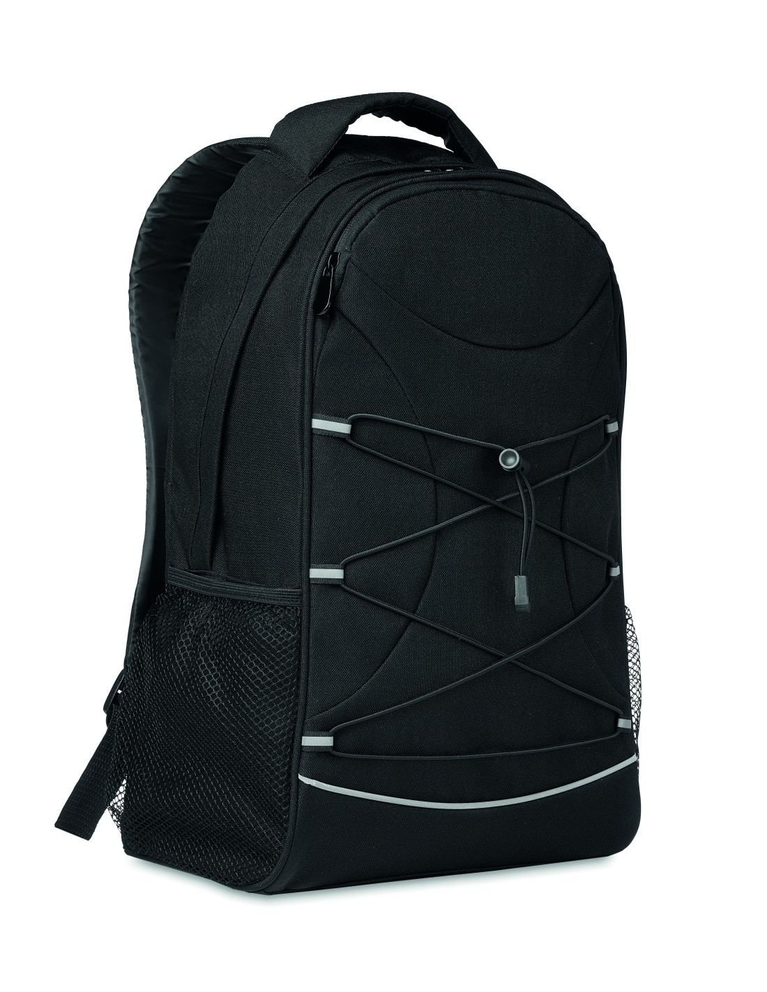 Zaino outdoor in poliestere 600D con inserti in 1680D con grande scomparto principale. Pannello posteriore imbottito. Tasche laterali in rete. Senza PVC. Capacità 20L.