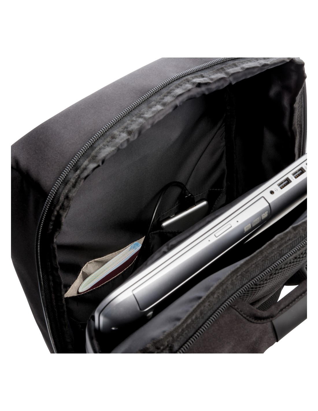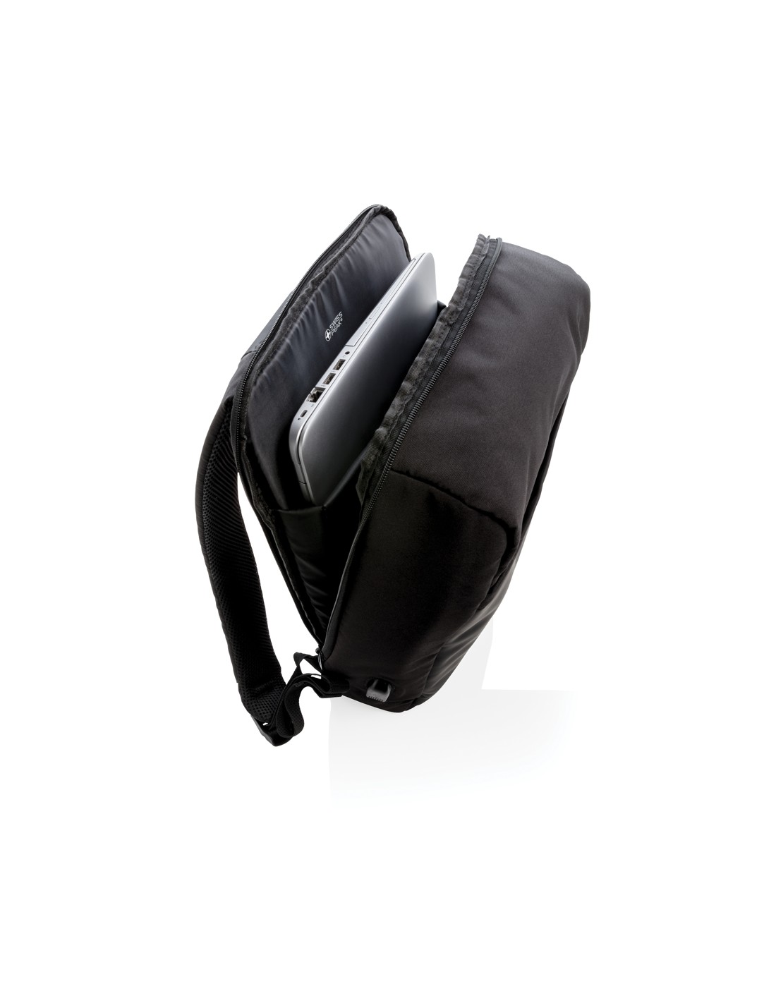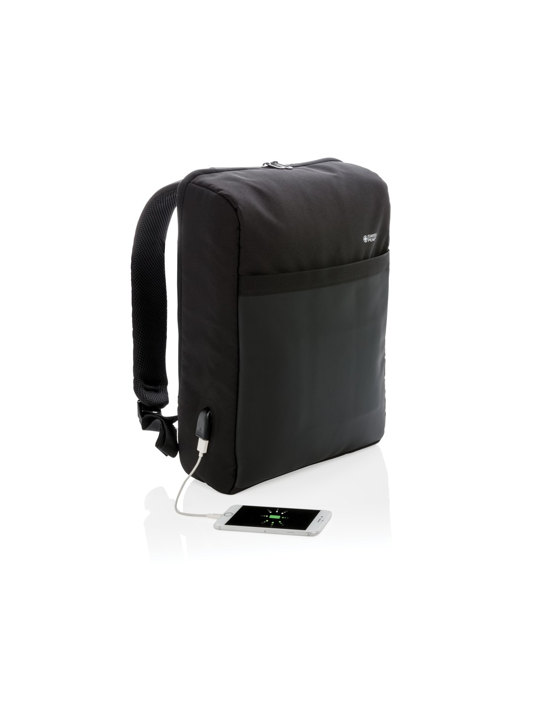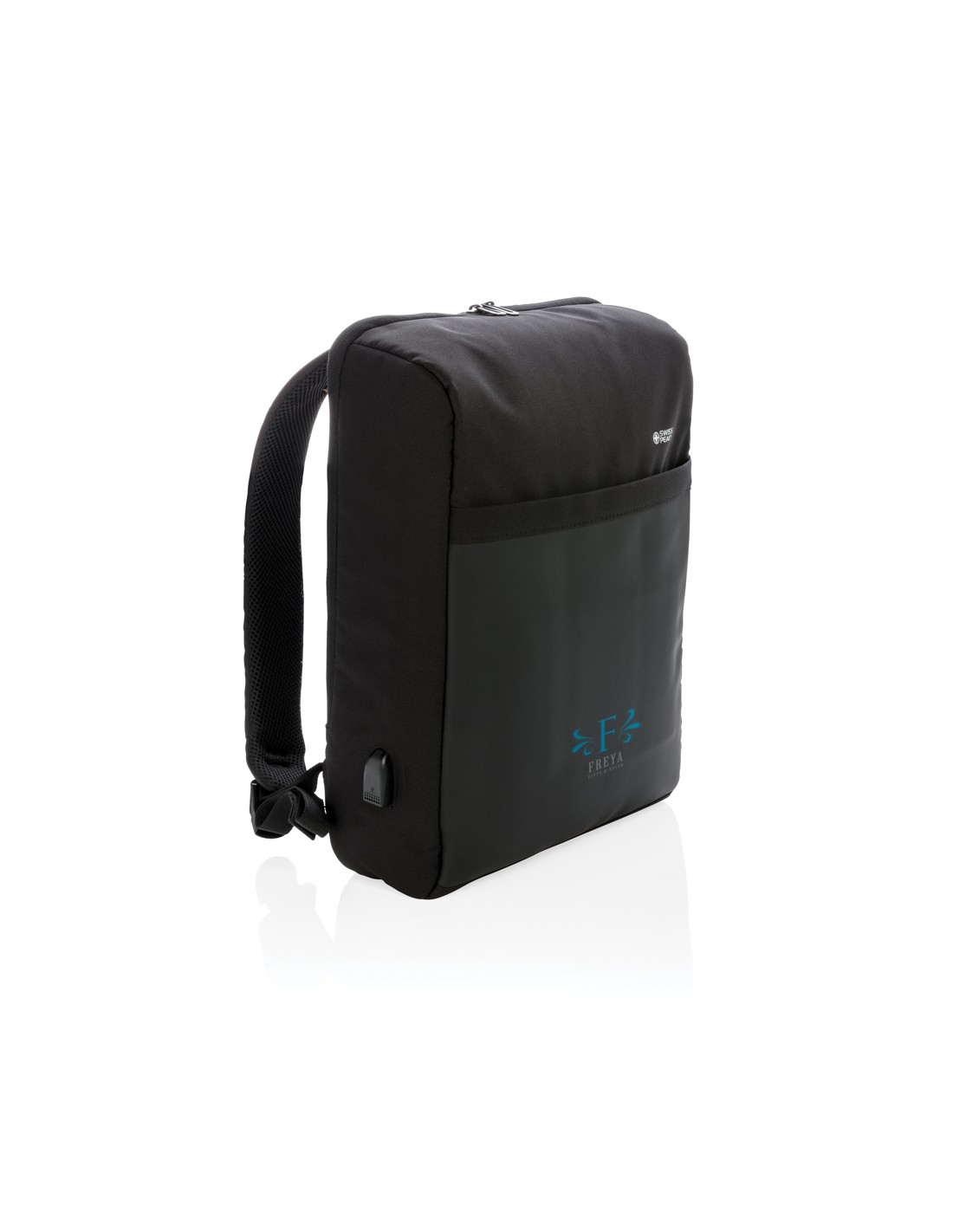 Zaino business realizzato in PET riciclato (equivalente a 22 bottiglie riciclate) con tessuto impermeabile 1680D. Lo zaino è dotato di scomparti imbottiti per portatili e/o tablet da 15,6". Lo zaino può essere chiuso grazie a un moschettone sul davanti e a una tasca anteriore protetta. Sul lato...