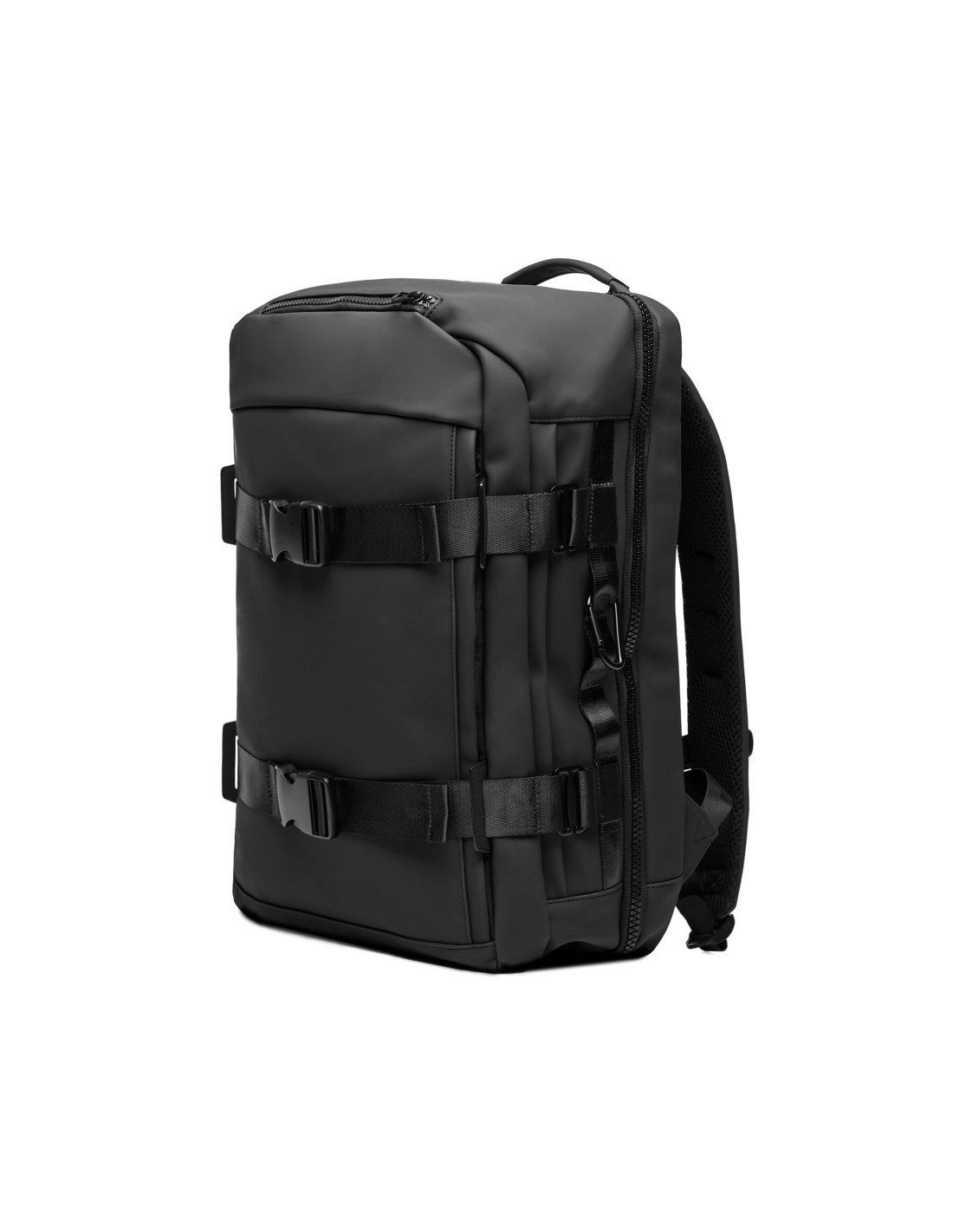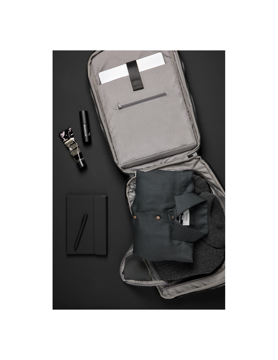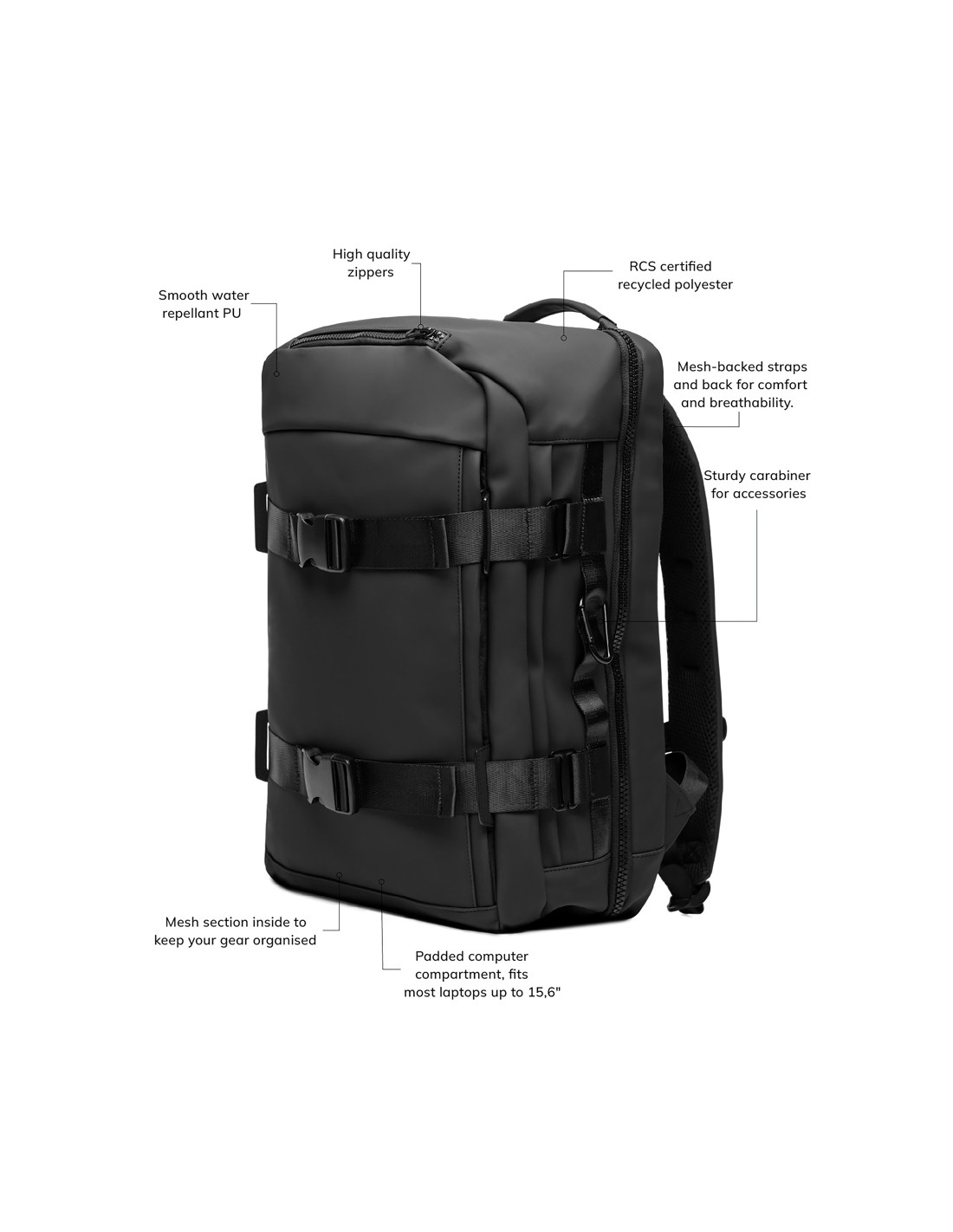 Borsa per bicicletta impermeabile con chiusura roll-top realizzata con materiali riciclati certificati GRS. Presenta uno scomparto imbottito per portatile da 15", diverse tasche con funzionalità organizzative, una chiusura a strappo regolabile per montarla facilmente su diversi tipi di biciclette...