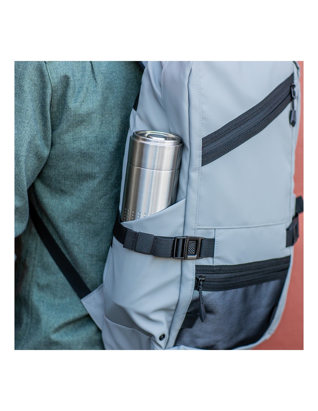 Realizzato in poliestere riciclato parzialmente certificato RCS. L'esterno è caratterizzato da un'elegante finitura in PU, con rivestimento in rete sugli spallacci e sullo schienale per garantire il massimo comfort. Può essere aperto completamente per un facile accesso. Include uno scomparto...
