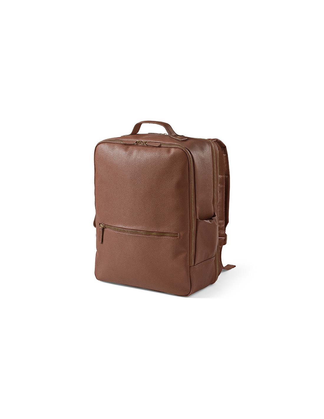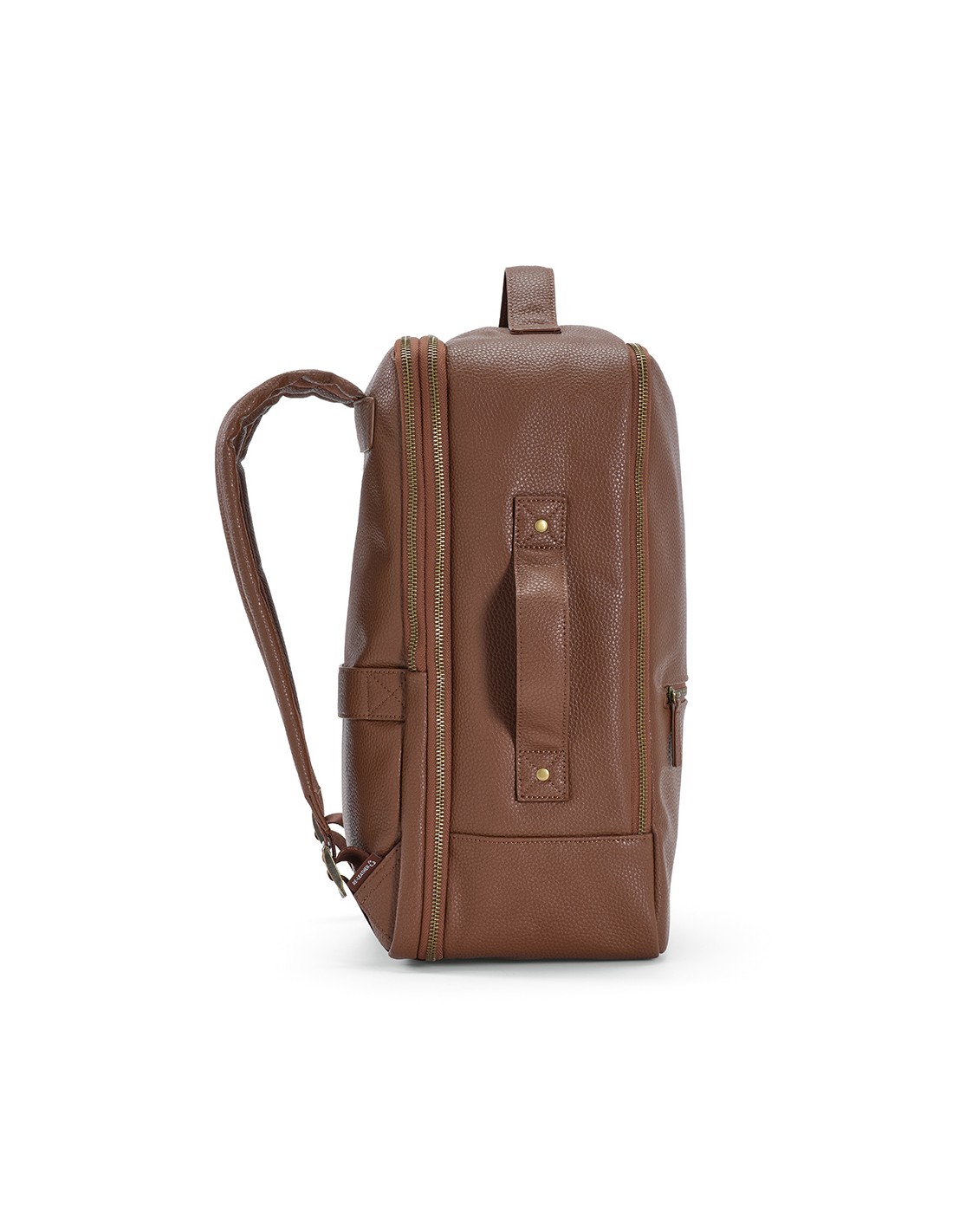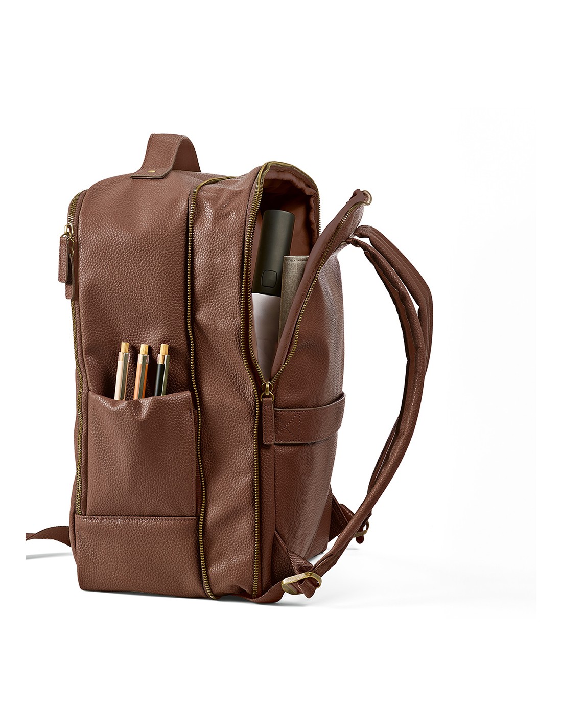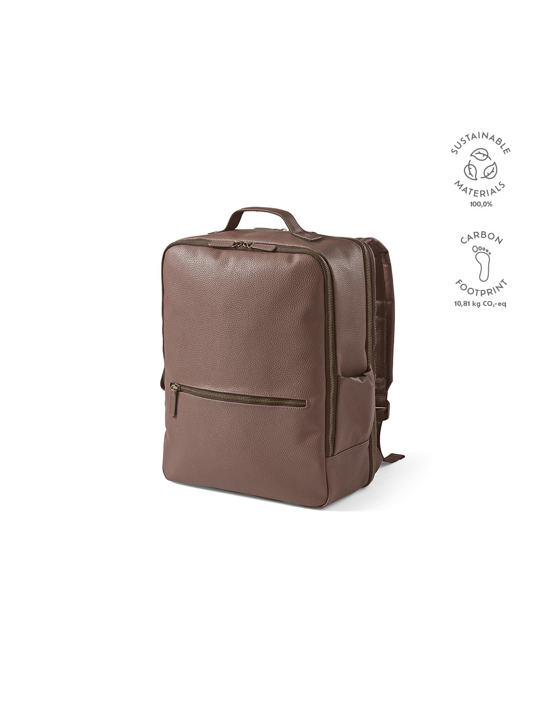 Zaino con parti colorate in 600D poliestere, cordino sulla parte frontale e tasche a rete sui lati.