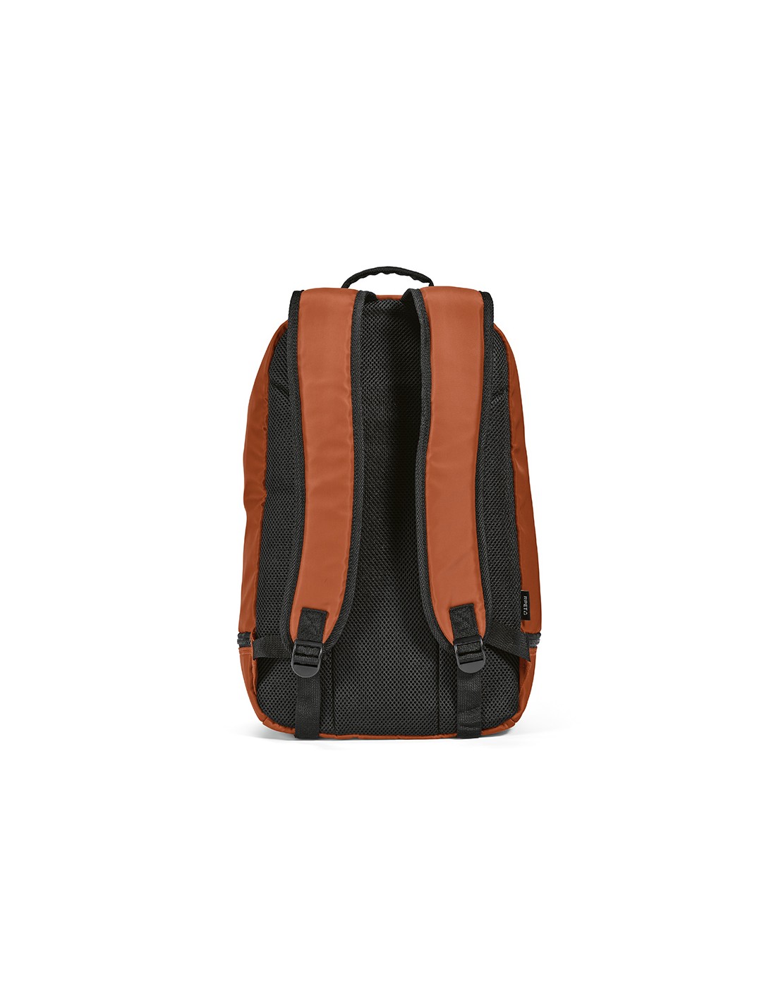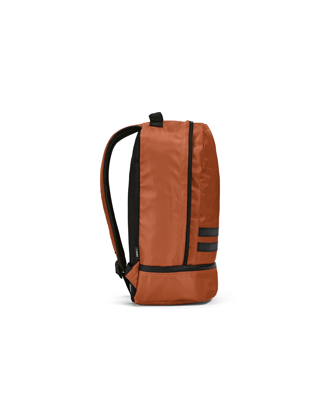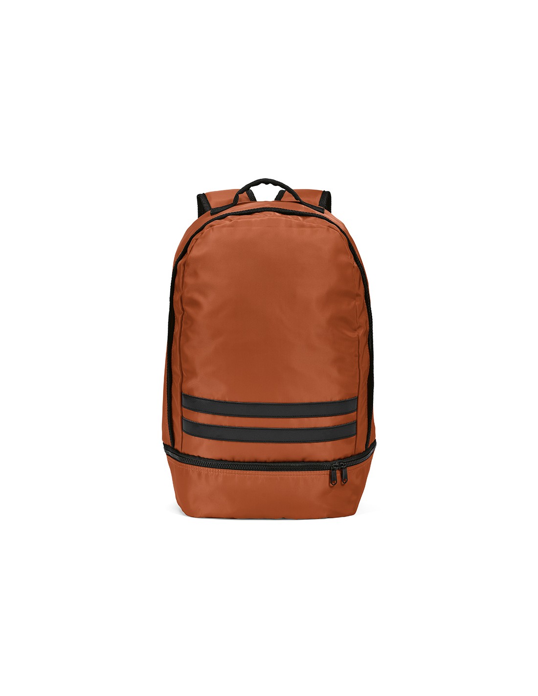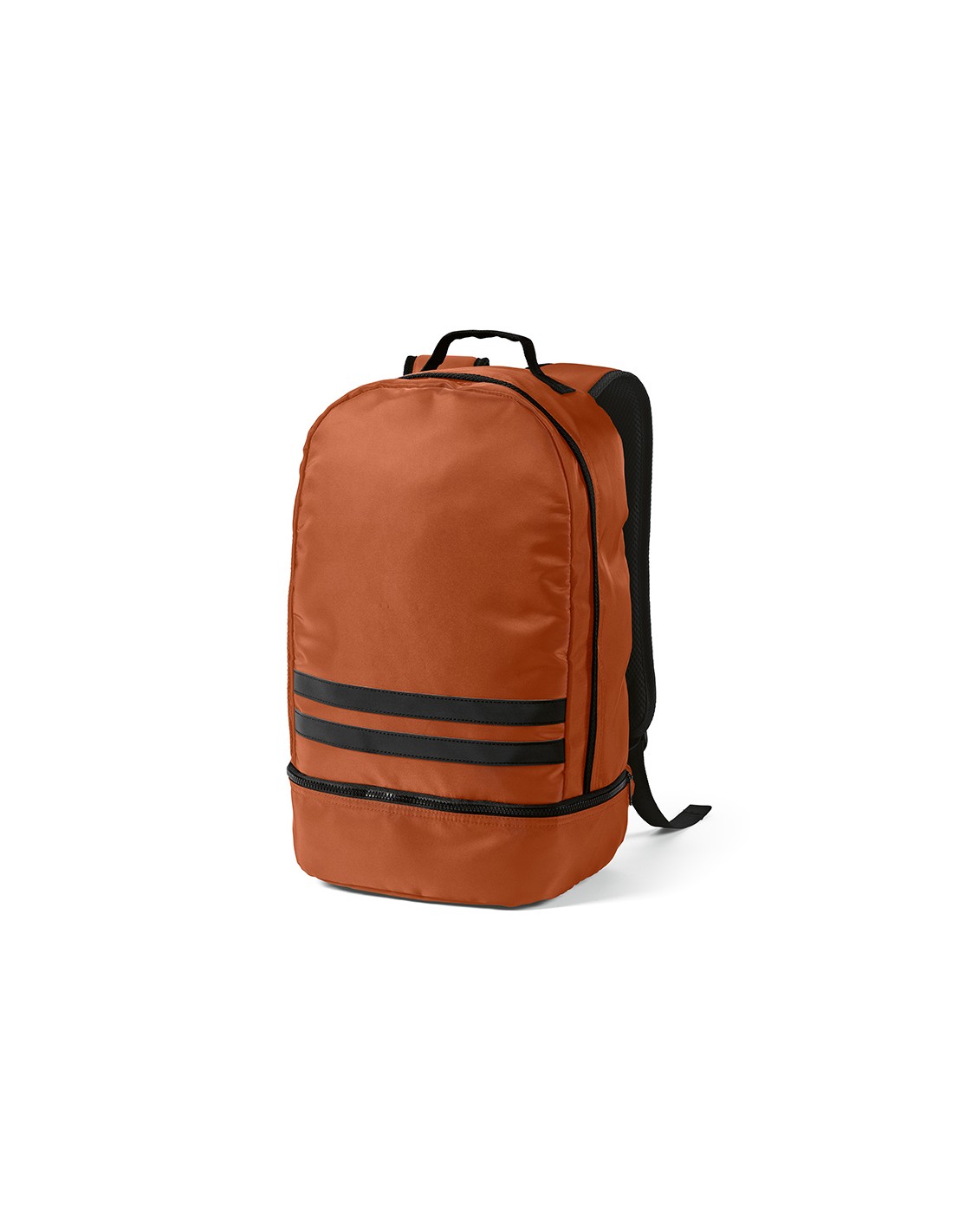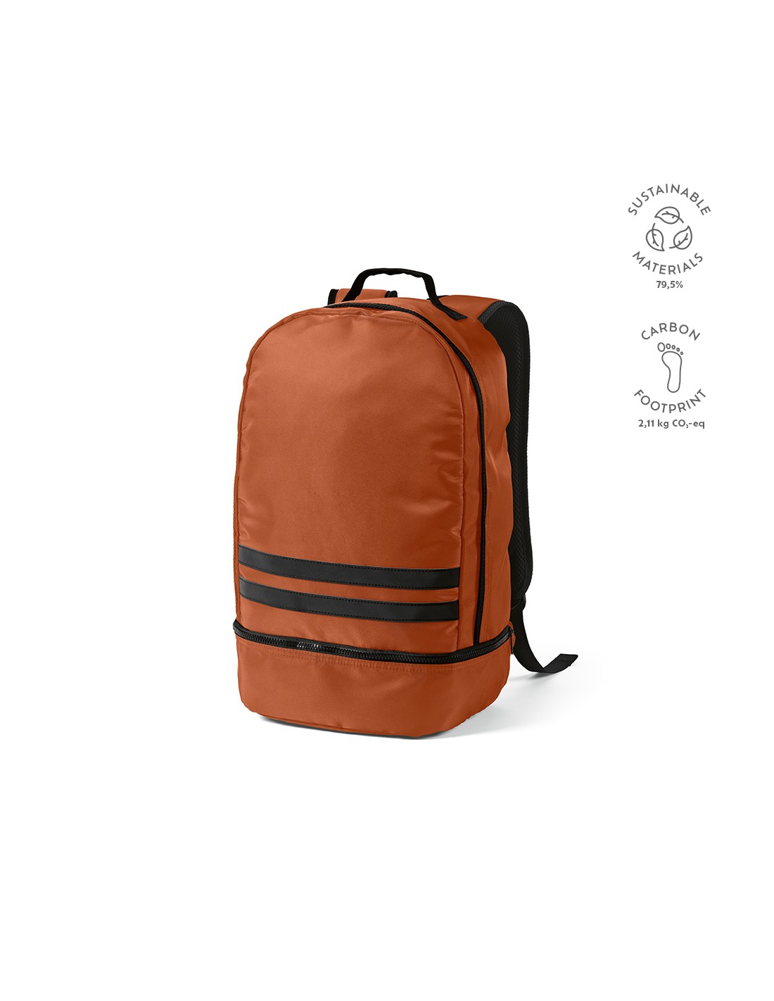 Zaino in RPET 600D con cordini scuri sul davanti e dettagli riflettenti. Tasche laterali in rete.